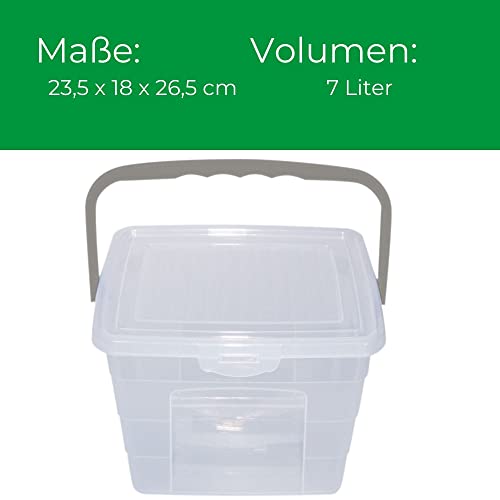 Pratico: il contenitore con manico per detersivo è trasparente e ha una capacità di 7 litri. Inoltre, la scatola è impilabile e impilabile.
