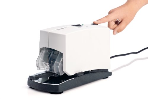 Cucitrice elettrica professionale per le esigenze più elevate per l'ufficio · Possibilità di regolazione manuale della forza d'impatto, a seconda della quantità di carta · Funzionamento tramite rete elettrica (230 V) · Inserto per cucitrice realizzato in metallo robusto · Scelta tra pinzatura aperta e chiusa · Profondità d'inserimento variabile (5-50 mm) · Meccanismo di caricamento a molla con doppia guida per graffette per una pinzatura precisa · Dimensioni: 14 x 35,5 cm (Larg x Lung) ·