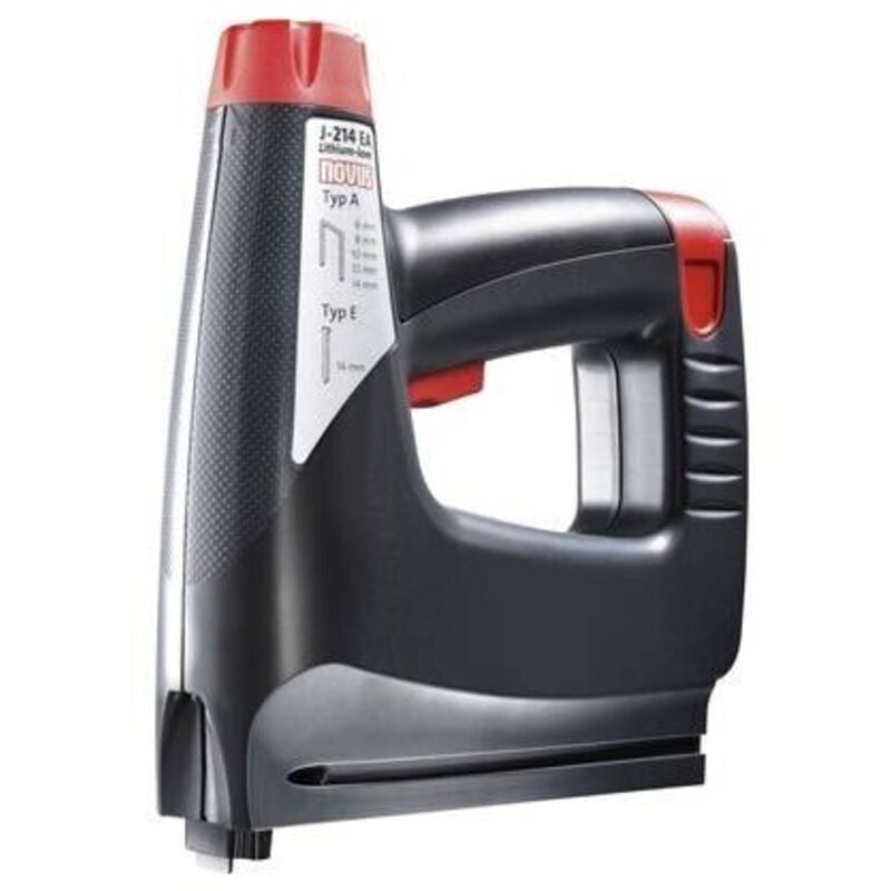 Sparachiodi professionale facile da usare ed ergonomica per inserire con precisione graffette in filo metallico fine e piatto, nonché chiodi. Pratico sparachiodi a batteria con superficie di presa Soft-Touch. Protezione contro l'uso involontario per una maggiore sicurezza. Luce a LED per illuminare l'area di lavoro. * Sistema di caricamento dal basso per ricaricare in modo rapido e semplice. * Arresto distanziatore per applicazione parallela di file di graffette. * Regolazione della forza di percussione. * Sblocco di sicurezza brevettato. * Ottimo accesso anche nei punti più stretti. * Finestrella d'ispezione per controllare la quantità rimanente di graffette. Fornitura: Inclusi una batteria agli ioni di litio, caricatore e valigetta di trasporto. Nota: Batterie di ricambio adatte vedi n. art. 078408. Dati tecnici Tipo di prodotto Sparachiodi Profondità inserimento graffette max., mm 14 Tipo di graffetta adatto E, A Denominazione originale prodotto J-214 Peso, kg 2,7 Alimentazione