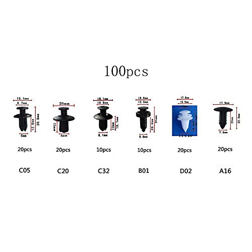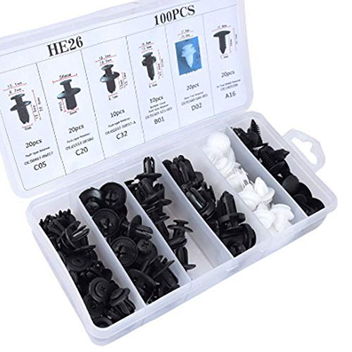 Assortimento di ganci universali da 100 pezzi con 1 attrezzo di sblocco per paraurti, rivestimento, passaruota, rivestimento porta, fermagli laterali in plastica.