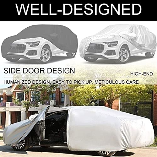 Design unico: la copertura della macchina ha una cerniera laterale per una facile manutenzione.La bella custodia a specchio rende la copertura più adatta.L'orlo elastico e la fibbia fissa aiutano a coprire forti venti e impediscono loro di soffiare sulla cappa per auto.Il materiale della copertura della macchina è liscia e delicata e non grafferà la vernice!