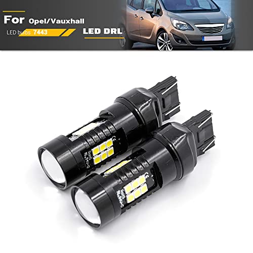 Alta luminosità: Ogni lampadina a led 7443 con lente del proiettore per Opel Vauxhall Meriva B DRL 2010-2017 luce di marcia diurna è dotata di 21 chip LED ad alta potenza 3030SMD, con potenza nominale 21W (MAX) e potenza di lavoro 5W, illuminazione estremamente luminosa a 360 gradi.