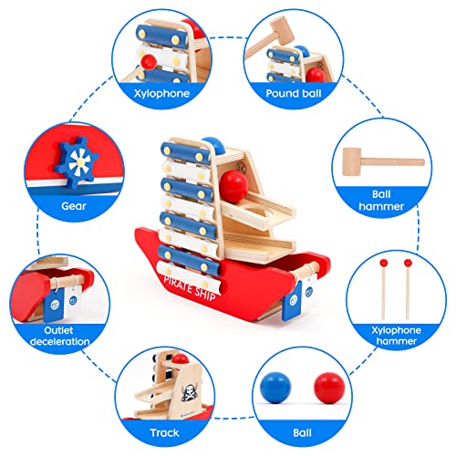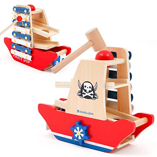 NUKied Chiodi e Martelli con Xilofono,Forma di Nave Pirata,Giocattoli Educativi in Legno Martellante e Martello Montessori Musicale di Legno per per la Prima Infanzia