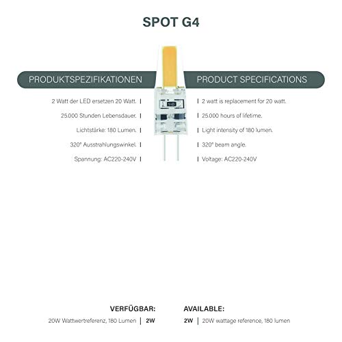 - I 2 W del COB NuLoXx LED G4 sostituiscono circa 20 W di potenza luminosa di un alogeno G4 convenzionale. Fino al 90% di risparmio energetico rispetto alle normali lampade alogene e ad incandescenza.