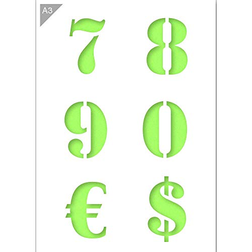 Numeri alfabeto 7 8 9 0 e valuta € $ stencil - Stencil di plastica - A3 42 x 29,7 cm - Circa. numeri di altezza 9 cm - Stencil riutilizzabile - Pittura, forno, artigianato, muro, stencil di mobili