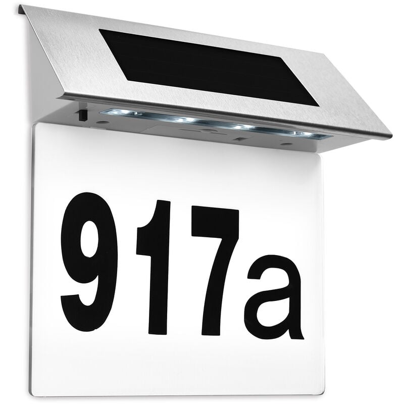 la lastra del numero civico in plastica temprata. In dotazione anche 3 serie di numeri adesivi 0-9 e 1x set di lettere minuscole a-h . Vantaggi: tecnologia solare 4 LED a lunga durata pannello per numero civico resistente agli agenti atmosferici facile da pulire con interruttore di accensione/spegnimento Interruttore crepuscolare 3 set di adesivi numerici 0-9 + 1x set di lettere minuscole a-f Dati tecnici: Dimensioni LxLxP: 19 x 18,5 x 6 cm LED: 4 Materiale: acciaio inossidabile / plastica batteria ricaricabile (AA-NI-MH 600mAh) Contenuto della confezione: 1 x numero civico con pallello