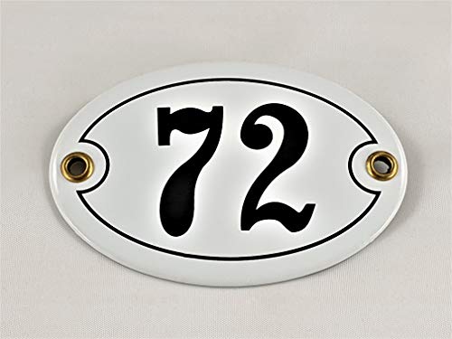 Numero civico smaltato n. 72, ovale, bianco e nero, realizzato a mano