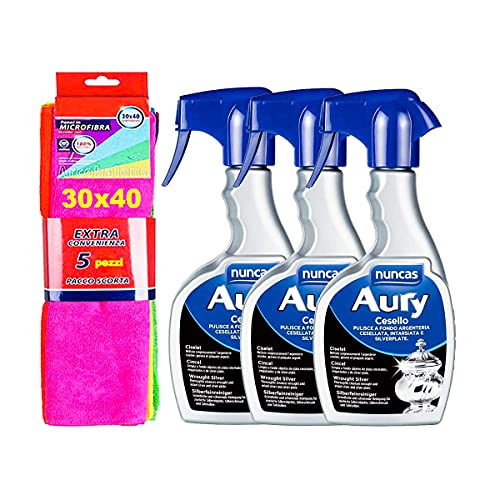 NUNCAS SET 3 PEZZI AURY CESELLO 200 ML + pacco scorta 5 panni in microfibra 30x40cm