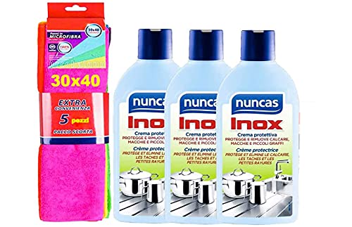 NUNCAS SET 3 PEZZI INOX CREMA PROTETTIVA 250 ML+Pacco 5 Pezzi Panni Microfibra 30X40 cm