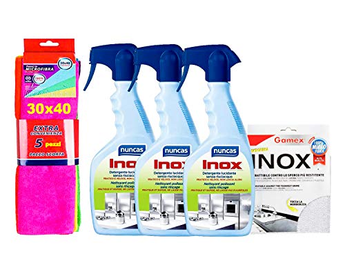 NUNCAS SET 3 PEZZI INOX DETERGENTE LUCIDANTE + Pacco scorta 5 panni in microfibra formato 30x 40cm