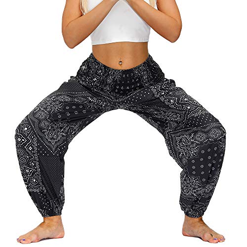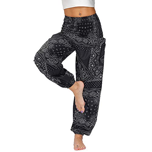 Nuofengkudu - Pantaloni da donna in stile hippie, leggeri, con tasche, sottili, in stile bohemien / etnico, con motivo floreale, estivi Y nero Totem Taglia Unica