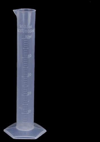 Cilindro graduato in plastica per test di laboratorio. Bordo e beccuccio conico per riempire e versare facilmente.