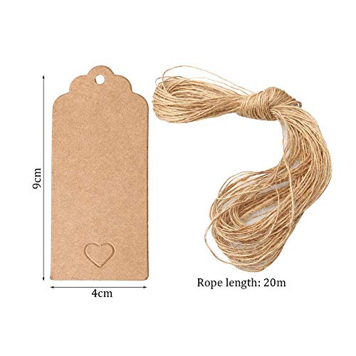Nuosen 100 pezzi carta kraft marrone etichette regalo, etichette per nome 4 cm x 9 cm rettangolare Hollow cuore marrone da appendere tag etichette per regali con corda 20 meters