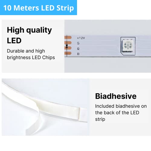 【Multiple Colors and Modes】LED Strip ha alta qualità 5050 SMD (10M) con dimmer e controllo della luminosità. Ha RGB (rosso, verde, blu) e bianco, 16 opzioni multi-colore, e le modalità di colore statico e dinamico, 8 livelli di luminosità da fioco a luminoso.