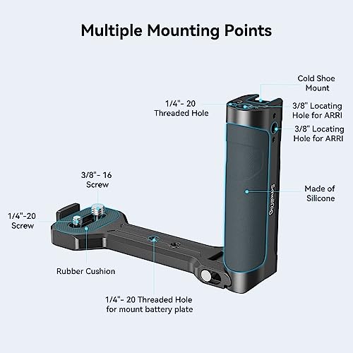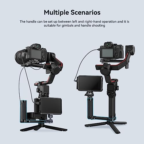 [Punti di Montaggio Multipli]: L'impugnatura laterale è dotata di fori filettati da 1/4"-20 per il fissaggio del kit di montaggio mini V-lock MD2801B, filetti da 3/8"-16 per ARRI per il fissaggio del supporto per monitor 2903B, braccio magico 3873, microfono, trasmettitore wireless e un cold shoe integrato per il fissaggio degli accessori, i fori filettati sul fondo consentono il fissaggio di una piastra per treppiede. Inoltre, è compatibile con l'attacco per treppiede originale dei gimbal.