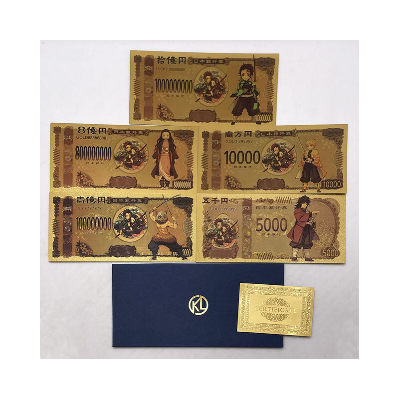 Nuovo design Anime giapponese Demon Slayer golden cards Kamado Tanjirou banconote in plastica oro 24k giappone anime yen bill per regali,5pcs- 1set