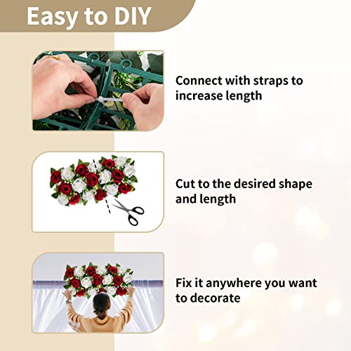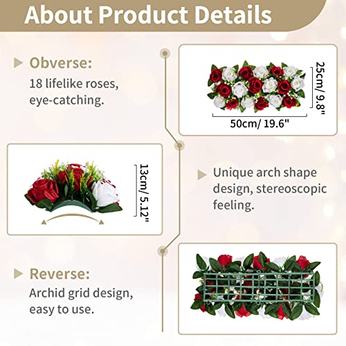 La Confezione Include: 2 pezzi di fiori finti rettangolari e 4 lacci. Lunghezza: 19.6" / 50cm, larghezza: 9.8" / 25cm. La base del fiore è una griglia ad arco in plastica e l'altezza massima è di 5.12" / 13cm. Rispetto ad altri centrotavola simili per matrimoni, è più ampio in larghezza e più alto in altezza, il che lo rende più prominente e attraente.