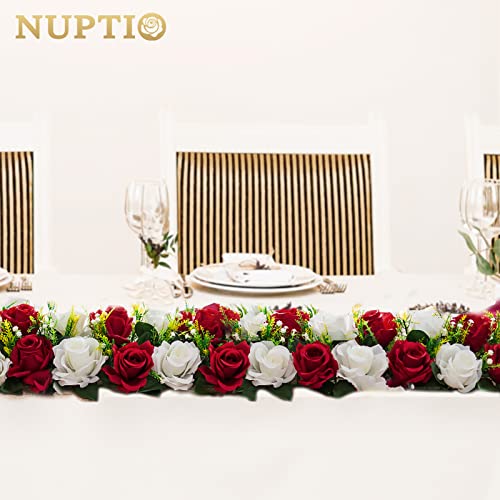 Nuptio Centrotavola di Fiori Artificiali per Tavoli - 2 Pezzi Cremisi Fiori Bianchi 50cm Lunghezza Finta Seta Floreale Rose Arrangiamenti per Matrimoni Festa Tavolo Runner Decorazioni da Pranzo