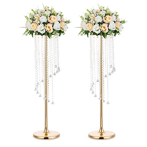 Nuptio Centrotavola Matrimonio Vasi D'oro - 2 Pezzi 90cm Altezza Vaso Fiori Cristallo Metallo Stand per Decorazioni Tavoli Festa Eleganti per Matrimoni Sfusi Centrotavola Lampadari Tavolo
