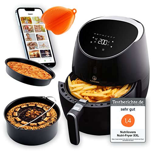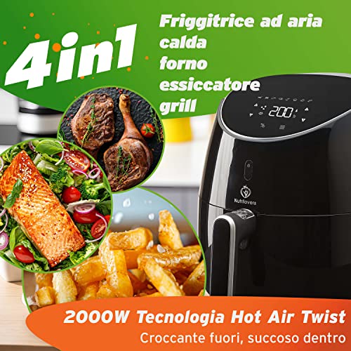 NUTRI-FRYER Friggitrice ad Aria Calda XXL 5L [2000W] Airfryer Grande - Timer, Digitale Touchscreen - Friggitrice per Patate Fritte senza Grasso & Olio - Vassoio per Pizza + Barile