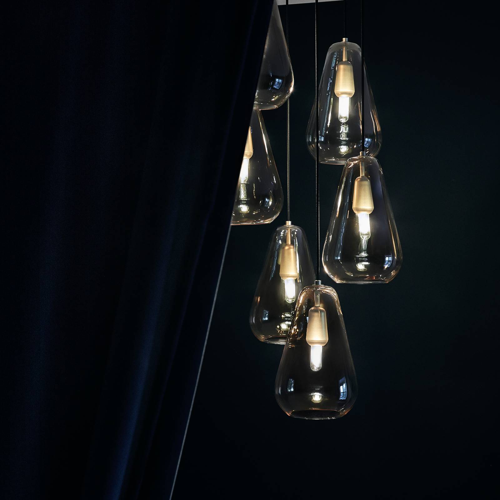 Lampada a sospensione scandinava Anoli 6 in design a goccia - progettato da Sofie Refer La lampada a sospensione a sei luci Anoli 6 è la fonte di luce ideale per l'ampia zona giorno e pranzo o per la spaziosa scala nelle vostre quattro mura. Allo stesso tempo, è una fonte di luce perfetta per l'ingresso e le sale di ricevimento, nonché per i foyer di alberghi e ristoranti. L'apparecchio a sospensione Anoli 6 della gamma Nuura Aps è una bella fonte di luce e, con il suo aspetto decorativo, un vero ornamento per qualsiasi stanza. L'apparecchio è stato realizzato con materiali di alta qualità e consiste in metallo verniciato a polvere e vetro soffiato a mano. Con il suo concetto di illuminazione aperta, l'apparecchio corrisponde alla tradizione del design nordico, che mette in primo piano la semplicità e la ricchezza della natura. La decorazione, sotto forma di gocce, simboleggia la purezza della natura nordica boscosa e la pioggia, che come fonte di ossigeno e acqua incarna l'epitome della vita. I paralumi di diverse altezze formano un'allegoria di gocce di pioggia che cadono dolcemente. In linea con la tradizione del design scandinavo, i progetti della designer danese di illuminazione Sofie Refer si basano sul principio della semplicità e del rispetto della natura e dell'ambiente. La laureata della Royal Danish Academy of Fine Arts ha già ricevuto diversi premi per i suoi design amanti della natura, tra cui il German Design Award 2019. Poiché, secondo le ultime scoperte scientifiche, la luce ha un effetto anche sull'umore, sulla frequenza cardiaca e sulla capacità di lavorare, Sofie Refer e il suo team di design Nuura Aps si sforzano di creare apparecchi di alta qualità che abbiano anche un'influenza positiva sul benessere.