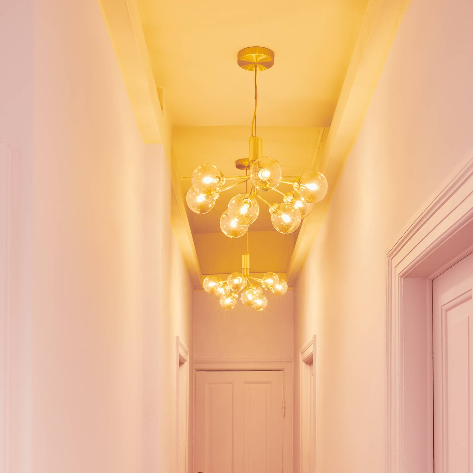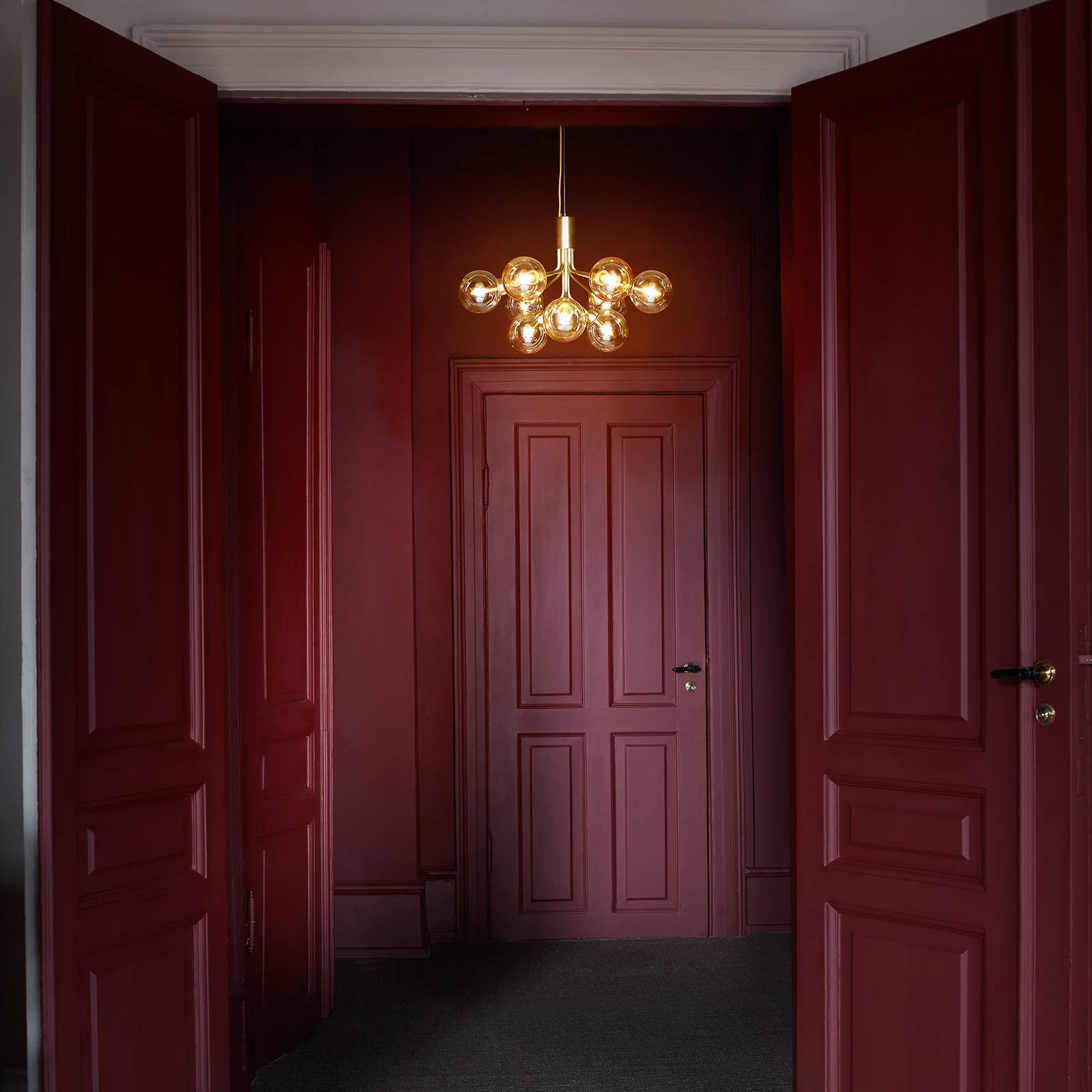 Lampada a sospensione a nove lampade di design scandinavo Apiales 9 in look aggraziato Nel progettare la collezione Apiales, la lighting designer danese Sofie Refer si è ispirata ai fiori della natura scandinava. Di conseguenza, le braccia che si dispiegano dal baldacchino sono disegnate come stili di fiori, in cima ai quali le sfere di vetro soffiato a mano troneggiano come il polline di un fiore. In questo modo, l'arredamento dell'Apiales 9 è completamente in linea con il concetto di design scandinavo, che è sempre vicino alla natura nel suo apprezzamento e ammirazione per la natura nordica. La lampada a sospensione Apiales 9 forma una fonte di luce decorativa sopra ogni tavolo da pranzo ed è perfettamente adatta come illuminazione principale per i salotti o la zona gastronomica. Grazie al suo classico arredamento scandinavo, che si basa sulla semplicità, può essere combinato con quasi tutti gli stili di vita - sia moderni che vintage. Dotato di fonti di luce bianca calda, diffonde ovunque un'atmosfera piacevole e accogliente, invitandovi a cenare comodamente e a sentirvi bene. Dal 2017, l'azienda danese Nuura Aps crea apparecchi di design di vario tipo, che da un lato colpiscono con un design elegante e senza tempo e dall'altro sono anche destinati a influenzare positivamente il benessere. Le ultime scoperte della scienza e della ricerca hanno dimostrato che la luce ha anche un effetto sull'umore e sulla salute. Pertanto, la fondatrice Sofie Refer si è data il compito di progettare apparecchi di illuminazione che abbiano un aspetto estetico e di buon gusto, nonché un effetto positivo sul benessere.