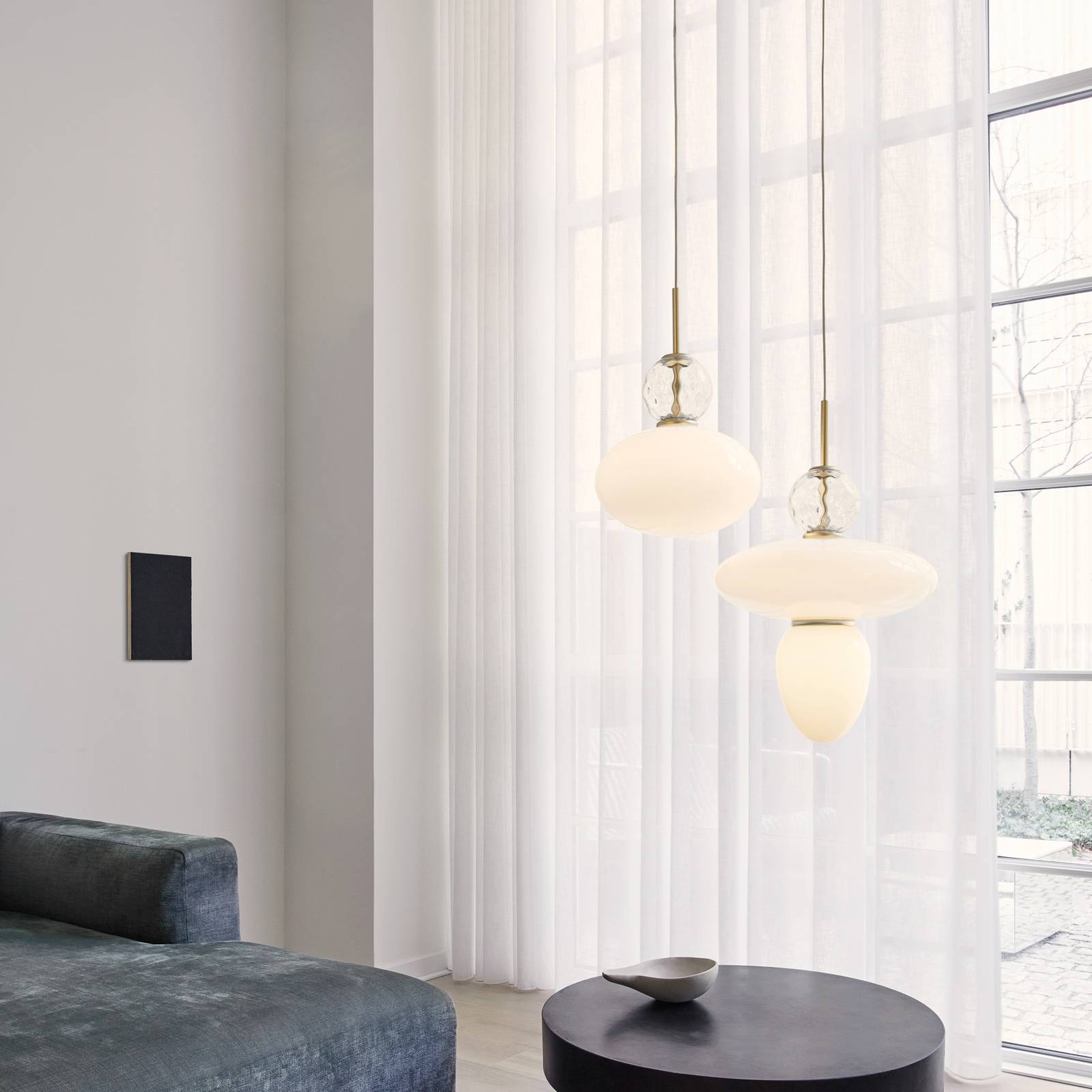 Lampada a sospensione Rizzatto 43 - fonte di luce dalla forma perfetta e oggetto di design esclusivo Il design formoso della lampada a sospensione Rizzatto 43 viene dal designer di illuminazione di fama internazionale Paolo Rizzatto. I paralumi sono fatti di vetro soffiato a bocca e disegnati in una forma organica, le cui curve sottili appaiono flessibili e graziose. Grazie al vetro bianco opalino, la luce si dispiega senza riflessi e in modo uniforme nella stanza. Se l'apparecchio è dotato di una lampadina bianca calda, emette una luce piacevole e accogliente, ideale per i salotti. È possibile utilizzare una lampada dimmerabile per regolare la luminosità. Il Rizzatto 43 può fornire un'illuminazione elegante nella zona giorno così come in ristoranti, hotel, musei o gallerie. Grazie al design senza tempo, l'apparecchio può essere combinato senza sforzo con qualsiasi stile interno. Perché con questo oggetto di design si possono progettare efficacemente sia stanze arredate in modo moderno che senza tempo. Rizzatto 43 è molto più di una semplice fonte di luce. È un oggetto di design e un mobile che arricchisce lo stile di vita prevalente con un tocco glamour. La collezione Rizzatto è stata progettata dal lighting designer di fama internazionale Paolo Rizzatto ed è prodotta dal produttore danese di illuminazione Nuura Aps. Dal 2017, l'azienda danese produce apparecchi di alta qualità con l'obiettivo di diffondere la luce e la gioia. Con il suo fascino per i lampadari, il designer italiano si adatta perfettamente a Nuura Aps, che intende il lampadario come il centro dell'illuminazione estetica.