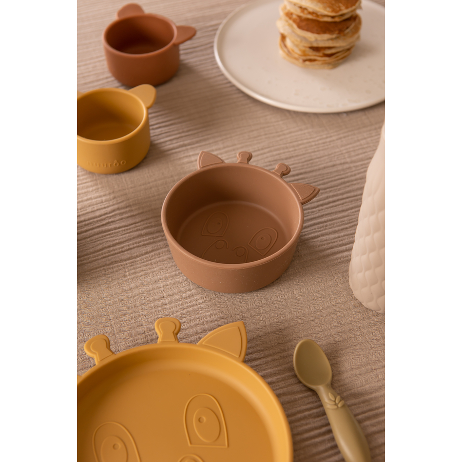 Dettagli del prodotto: Simpatiche ciotole di Nuuroo realizzate in silicone privo di sostanze nocive. Le ciotole sono disegnate con simpatiche orecchie di animale e sono facilmente impilabili l'una con l'altra. Ideali per il muesli e gli spuntini tra un pasto e l'altro. Il materiale morbido è infrangibile e può essere facilmente afferrato dalle mani dei bambini. Design: Malto al cioccolato Materiale e dimensioni: 100% silicone Dimensioni: 13 x 12 x 8 cm Peso: 228 grammi Istruzioni per la conservazione e la cura: Il silicone è adatto agli alimenti, alla lavastoviglie e al microonde. La consegna include: 2x Ciotola in silicone per malto al cioccolato Alex Giraffe