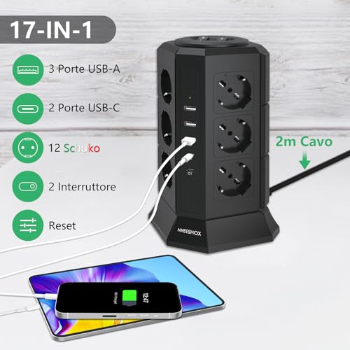 NVEESHOX Ciabatta Multipresa Verticale con 12 Prese Universali Schuko (4000W 10/16A) & 2 USB-C (20W PD3.0) & 3 USB-A, IT Multipresa Verticale protezione Sovratensione con Interruttore,Cavo 2 M (Nero)