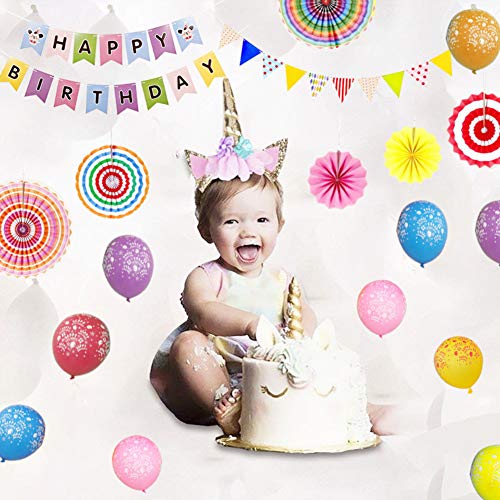Nvetls Compleanno Balloons Banner Kit Feste Compleanno Bambini con Fiore di Ventaglio di Carta e Palloncini Colorati Stampati