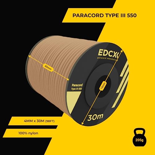 EdcX 4mm Nylon Paracord 550 30m (100 Piedi) - Tipo III, Corda 100% Nylon, Corda 7 Fili, Corda Nylon 4mm in Tinta Unita (Tan, 30 m)