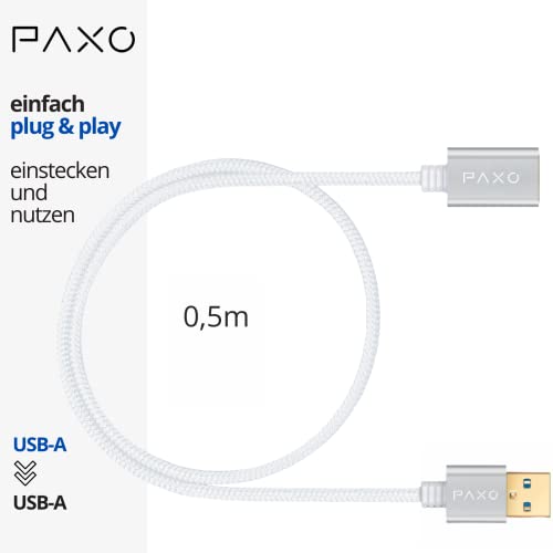PAXO 0,5 m Nylon USB Prolunga USB 3.0 bianca, cavo di prolunga A-A, spina in alluminio, rivestimento in tessuto