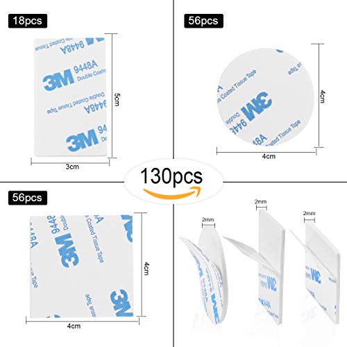 ✄【Confezione da 130 in 1】Confezione contiene 130 pezzi di tamponi biadesivi, 56 pezzi quadrati, 56 pezzi rotondi, 18 pezzi rettangolari, dimensioni dei cuscinetti quadrati in schiuma: 4 x 4 cm, diametro dei cuscinetti rotondi in schiuma: 4 cm, dimensioni rettangolari: 3 x 5 cm, spessore 2mm.