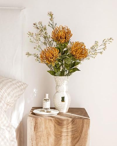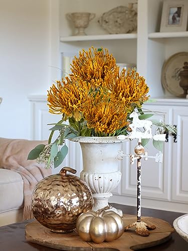 Questo bellissimo fiore si chiama "Leucospermum Cordifolium Flower" perché i suoi fiori sembrano grandi spilli bloccati in un cuscino sferico quando sono in piena fioritura, con uno splendido display. I fiori artificiali di crisantemo sono l'aggiunta ideale a molti decori, come decorazioni per festival, matrimoni, compleanni, feste, casa, ufficio, soggiorno, camera da letto, cucina, tombe, decorazioni autunnali e composizioni floreali.