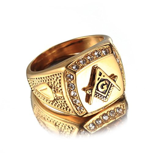OAKKY Uomo Acciaio Inossidabile Massonica Massone Anello con Diamante Biker Simbolo Membro Banda, Oro Misura 19