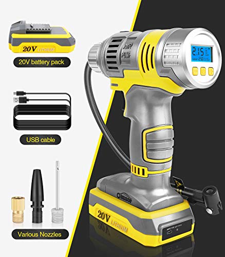 Oasser Compressore Aria Portatile 20V per Pneumatici con Batteria Ricaricabile agli ioni di Litio, manometro Digitale LCD, luci a LED, Cavo USB P2S, Giallo