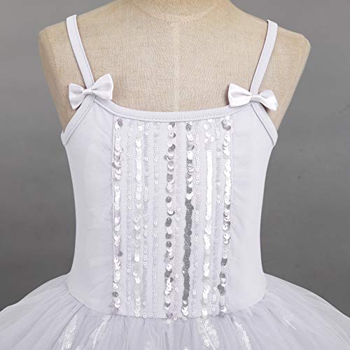 OBEEII Vestito da Balletto per Ragazze Spaghetti Paillettes Tutu di Balletto per Danza Classica Gonna da Ginnastica Costume di Ballo dei Bambina Abito Bianco 7-8 Anni
