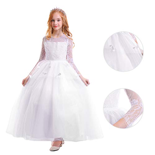 OBEEII Vestito Bambina Cerimonia Elegante Maniche Lunghe in Pizzo Floreale Abito da Principessa Sera Sposa Prima Comunione Damigella Bambina Cocktail Prom per Ragazze 8-9 Anni Bianco