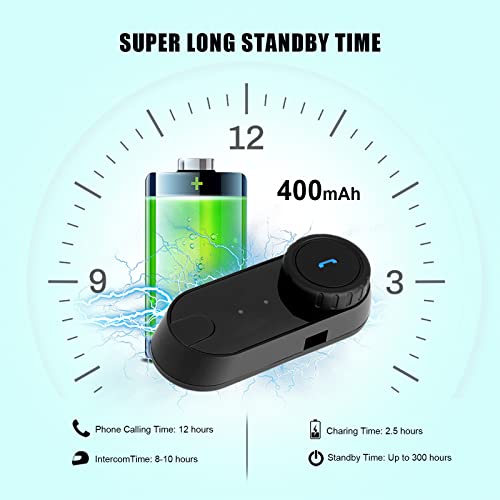 LUNGO TEMPO DI LAVORO: l'auricolare ha una batteria integrata agli ioni di litio ricaricabile da 400 mAh. Dopo 2,5 ore di carica completa, il tempo di standby è fino a 300 ore, il tempo di chiamata sul cellulare è fino a 10 ore e il tempo di interfono è fino a 5 ore. (Per proteggere la batteria, caricarla almeno una volta al mese)