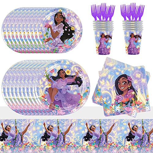 OBLRXM Isabella Stoviglie per Compleanno 61 Pezzi Isabella Party Tableware Stoviglie Carta Encanto Stoviglie per Feste di Compleanno, 20 Piatti, 20 tovaglioli, 10 Tazze Forniture per Feste Bambini