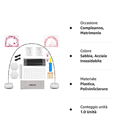 Facile da montare e smontare: è necessario collegare le aste, riempire i sacchetti della base con acqua o sabbia e unirli, quindi appendere i palloncini alle clip e inserirli nel tubo dell'arco per ottenere un fantastico arco di palloncini. Suggerimento: È necessario fare un po' di forza per piegare l'asta. Istruzioni per il montaggio incluse (lingua italiana non garantita).