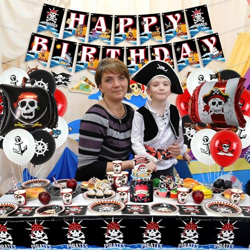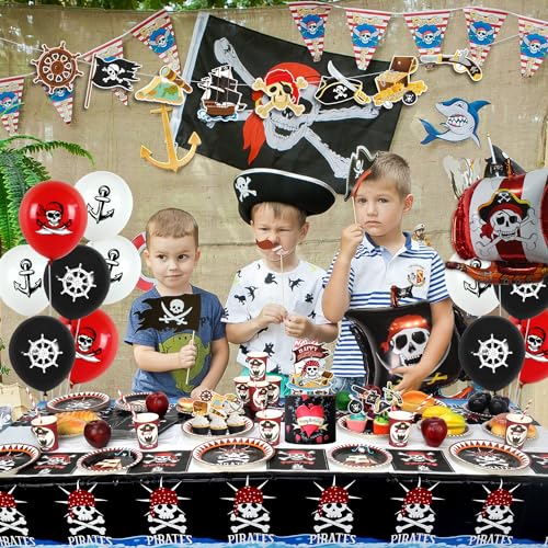 Obussgar Forniture per feste di compleanno pirata 141 pezzi Le decorazioni per feste pirata includono striscioni di buon compleanno Cake Topper per cupcake Palloncini per bambini