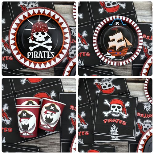 Materiali di alta qualità: tutto il set di stoviglie per forniture per feste in carta pirata è realizzato con materiale cartaceo di alta qualità. I piatti dei pirati e le tazze da festa dei pirati sono resistenti e durevoli;