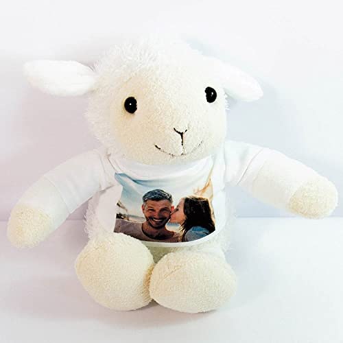 Peluche di pecora/agnello bianco da personalizzare. Questo peluche non è adatto a bambini di età inferiore ai 3 anni. Conforme alle norme CE. Un peluche per bambino (o bambino grande) da personalizzare con una foto personale