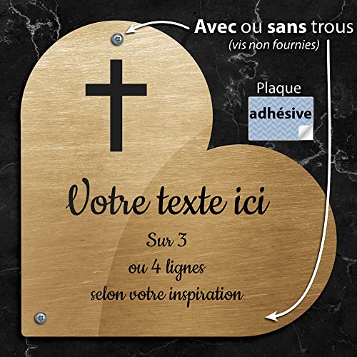 OCAP-FUNERAIRE.COM Targa incisa funeraria con croce cristiana autoadesiva, modello cuore (15 x 15 cm) personalizzata da 1 a 3 righe in oro spazzolato