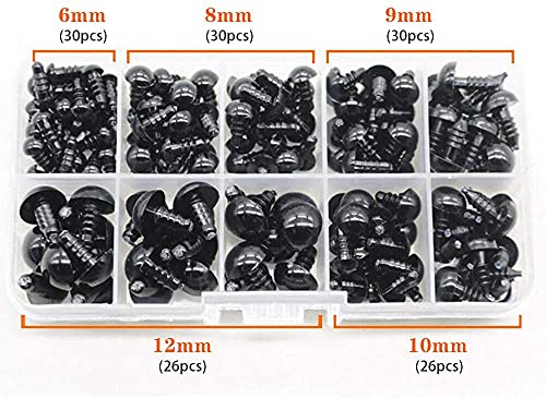 Occhi di Sicurezza 142 pezzi Nero Occhi di Plastic 6-12mm Occhi per Bambole con Rondella per Bambola Orsacchiotto Creazione Artigianale
