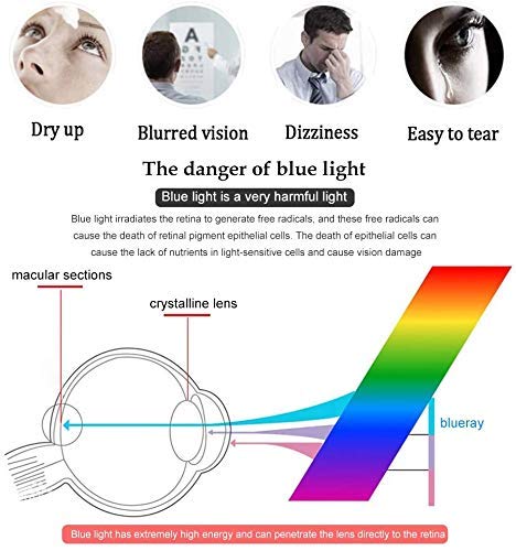 Proteggere Gli Occhi: L'obiettivo è realizzato in materiale anti luce blu, non è un film per bloccare la luce blu sulla superficie dell'obiettivo, il 90% della luce blu dannosa può essere filtrata da tale lente anti luce blu. È adatto per le persone che lavorano per lunghe ore su computer, tablet, giochi, al telefono o in TV. Possono proteggere efficacemente i tuoi occhi.