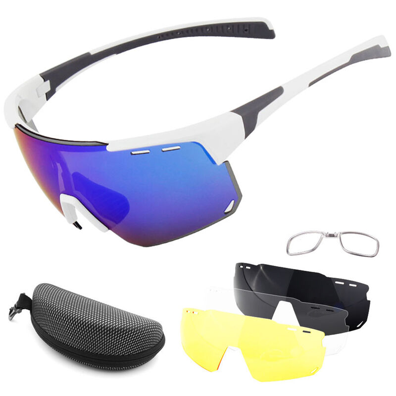 Con 3 lenti intercambiabili. Tutte le lenti degli occhiali da sole 100% rivestimento di protezione UV400, ti protegge dai dannosi raggi UVA e UVB. Ripristina il vero colore, elimina la luce riflessa e la luce diffusa. Il nasello in morbida gomma non provoca disagio anche se indossato a lungo. Caratteristiche: Dotata di 3 lenti intercambiabili, quella gialla è per la notte, la lente grigia polarizzata per i forti raggi solari e le lenti trasparenti per le giornate nuvolose. Rivestimento protettivo UV400, che blocca i dannosi raggi UVA e UVB, rendendo lo scenario più chiaro e morbido. Il nasello in morbida gomma ti consente di indossarlo a lungo senza affaticarti. Viene fornito con una montatura miopia che può essere incastrata nella scanalatura degli occhiali da sole. Scelta ideale per ciclismo, moto, corsa, sci, guida, pesca, alpinismo e altro ancora. Specifiche: Materiale: PC Colore lente: blu / argento (opzionale) Colore telaio: bianco e grigio/nero e giallo/nero e nero/nero e