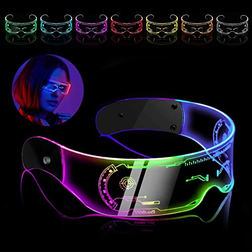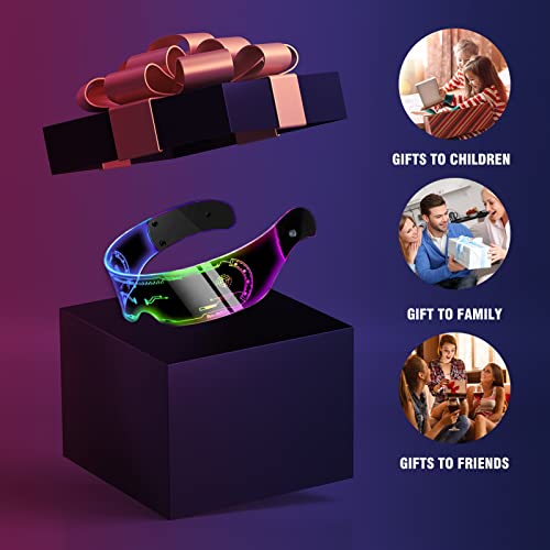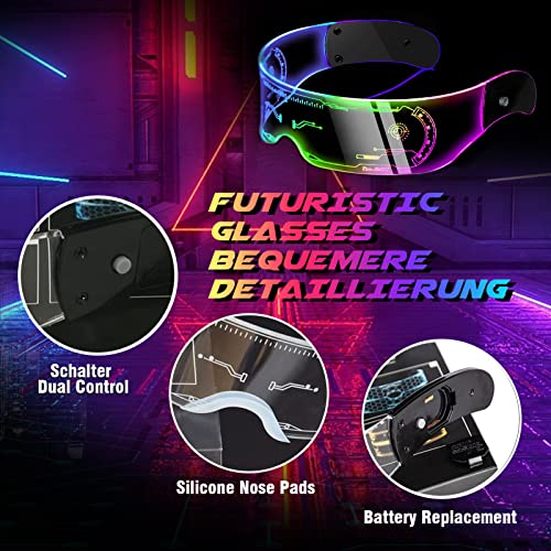 OCCHIALI PARTY LUMINOSI: Occhiali festa dotato di luci led multicolore, occhiali futuristici può emettere diversi colori e motivi, creando una forma unica per te. Ispirato alla cultura cyberpunk, cyberpunk glasses presenta un design futuristico con incisioni laser sulla parte anteriore e sui lati occhiali led, occhiali luminosi ha un aspetto fantastico quando è illuminato al buio.