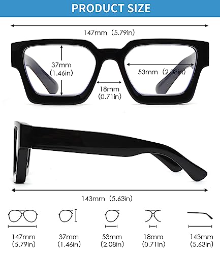 Caratteristiche del prodotto: montature quadrate larghe e durevoli di alta qualità, lente d'ingrandimento che blocca la luce blu, ponte a sella e cerniera in metallo.